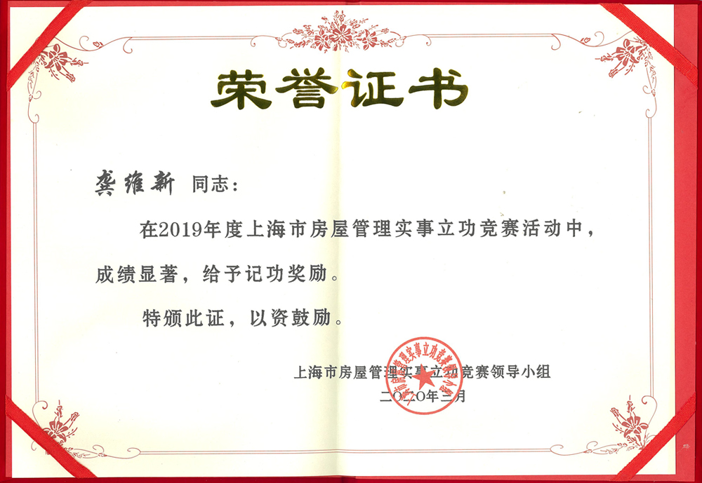 上海維方建筑裝飾工程有限公司第二項(xiàng)目部獲評(píng)2019年度上海市房屋管理事實(shí)立功競(jìng)賽城市更新分賽區(qū)優(yōu)秀團(tuán)隊(duì)稱(chēng)號(hào),公司總經(jīng)理獲評(píng)記功個(gè)人。